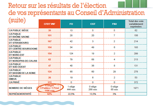 Être élu au CA est un passage impératif pour avoir accès aux informations stratégiques et pouvoir porter nos revendications sur les choix de gestion au plus haut niveau. Depuis que nous siégeons au CA, nous sommes parvenus à faire bouger les lignes ! Nous gardons les manches relevées et continuerons à porter les problématiques VNF devant les représentants de l’État, dont notre ministère de tutelle.