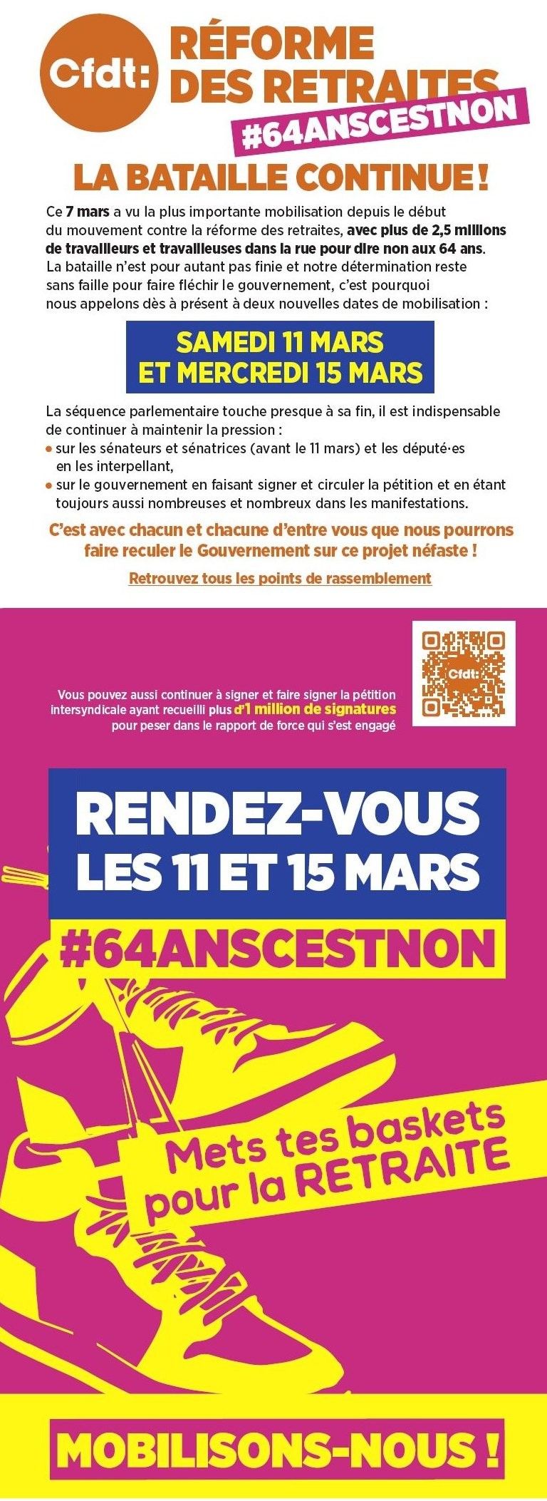 Vous trouverez ci-dessous les informations liées aux mobilisations du samedi 11 et mercredi 15 mars.