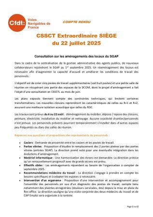 Compte rendu de la CSSCTL Extraordinaire du 22 juillet 2025 Écrit par Florence Dequiret le 28 juillet 2025. Publié dans Instances locales, Siège. aménagement des locaux du SGAP « Précédent Suivant »