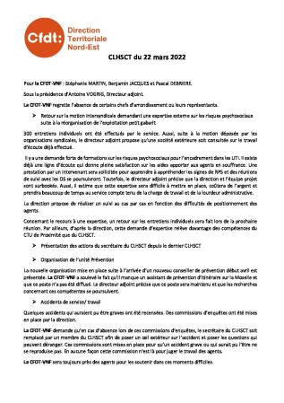 Compte rendu du CLHSCT du 22 mars 2022 Écrit par Florence Dequiret le 18 août 2022. Publié dans Instances locales, Nord-Est. « Précédent Suivant »
