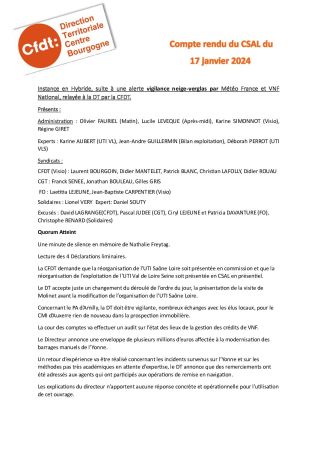 Compte-rendu du CSA local du 17 janvier 2024 Écrit par Cindy Leroy le 24 janvier 2024. Publié dans Centre Bourgogne, Instances locales. « Précédent Suivant »