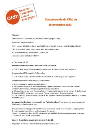 Compte-rendu du CSA local du 16 novembre 2023 Écrit par Cindy Leroy le 24 novembre 2023. Publié dans Centre Bourgogne, Instances locales. « Précédent Suivant »