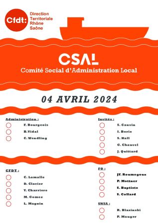Compte rendu CSAL du 4 avril 2024 Écrit par Florence Dequiret le 25 avril 2024. Publié dans Instances locales, Rhône Saône. « Précédent Suivant »