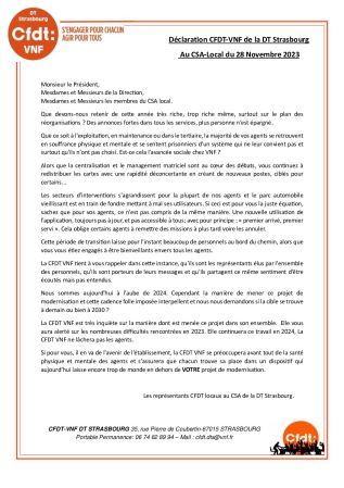 Déclaration préalable au CSA local du 28 novembre 2023 Écrit par Cindy Leroy le 28 novembre 2023. Publié dans Instances locales, Strasbourg. « Précédent Suivant »