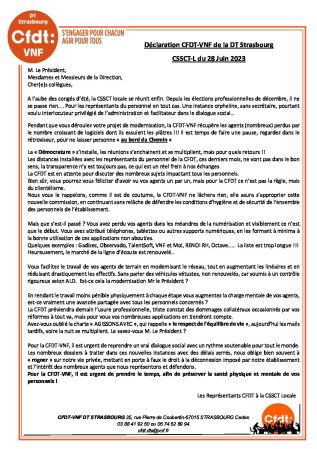Déclaration préalable à la CSSCT locale du 28 juin 2023 Écrit par Cindy Leroy le 5 juillet 2023. Publié dans Instances locales, Strasbourg. « Précédent Suivant »