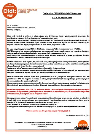 Déclaration CTUP 28 juin 2022 Écrit par Florence Dequiret le 4 juillet 2022. Publié dans Instances locales, Strasbourg. « Précédent Suivant »
