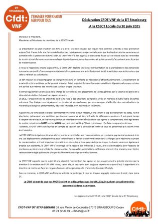 Déclaration préalable à la CSSCT locale du 10 juin 2025 Écrit par Cindy Leroy le 10 juin 2025. Publié dans Instances locales, Strasbourg. « Précédent Suivant »