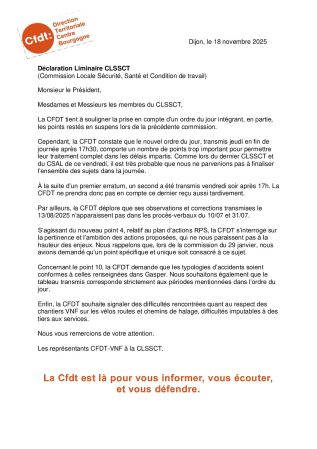 Déclaration préalable au CSSCTL du 18 novembre 2025 Écrit par Cindy Leroy le 2 décembre 2025. Publié dans Centre Bourgogne, Instances locales. « Précédent Suivant »