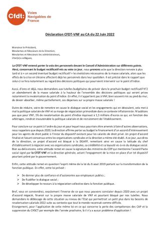 Déclaration préalable CFDT VNF au CA du 22 juin 2022