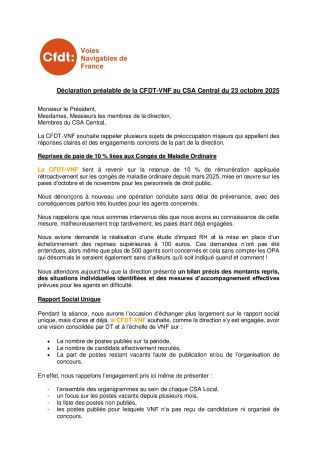 Déclaration préalable CSA Central du 23 octobre 2025 Écrit par Florence Dequiret le 24 octobre 2025. Publié dans Actualité accueil, Documents accueil. « Précédent Suivant »