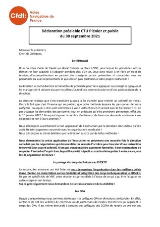 Déclaration préalable CTU Plénier et public du 30 septembre 2021 Écrit par webm@ster le 30 septembre 2021. Publié dans Non classé. non application instruction télétravail pérenne avenir des OPA création corps PETPE spécifique à VNF évolution statutaire PETPE « Précédent Suivant »