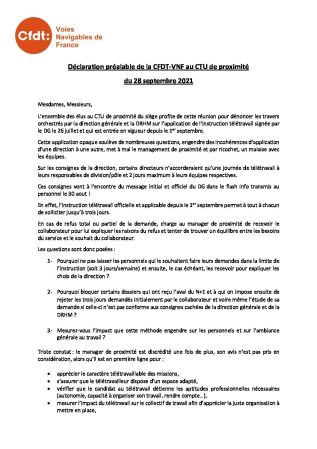 Déclaration préalable de la CFDT-VNF au CTU de proximité du Siège du 28 septembre 2021 Écrit par webm@ster le 28 septembre 2021. Publié dans Non classé. Déclaration préalable de la CFDT-VNF au CTU de proximité du Siège du 28 septembre 2021 Télétravail fonctionnement « Précédent Suivant »