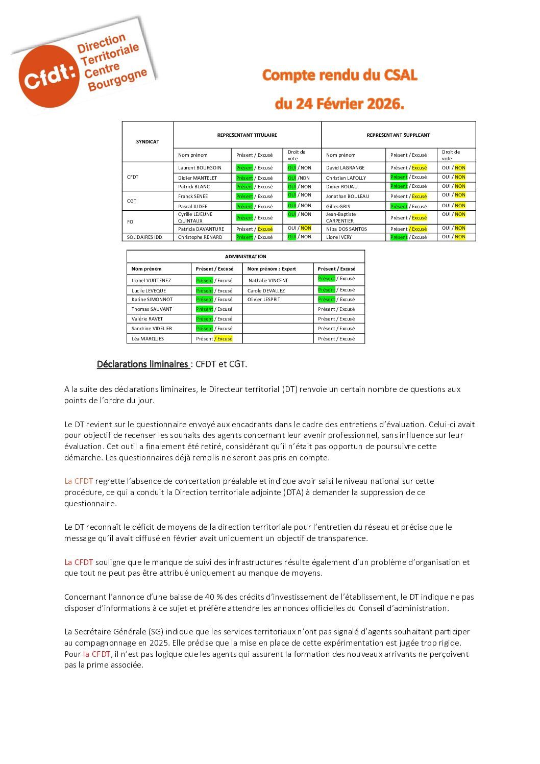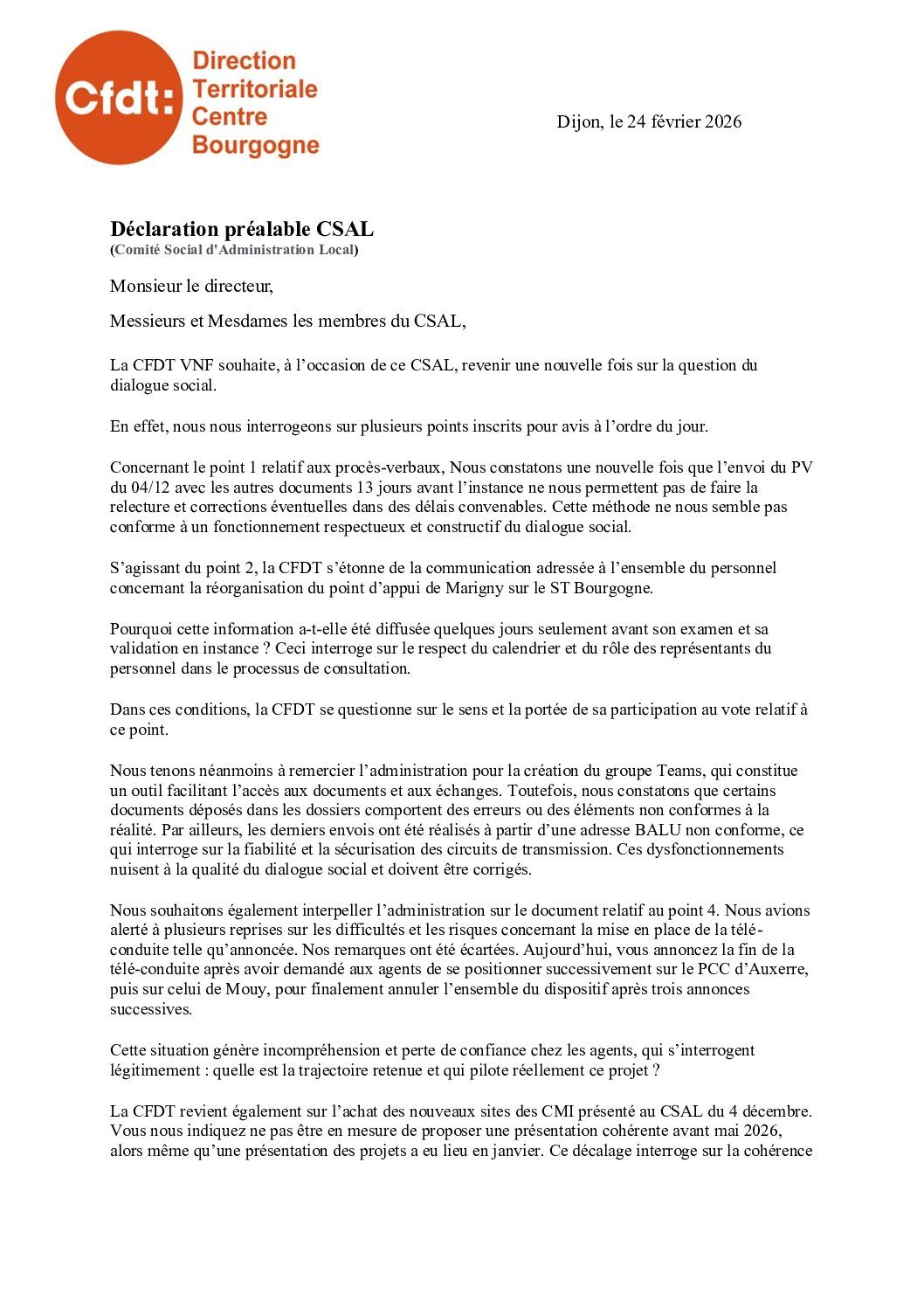 Déclaration préalable au CSSCTL du 18 novembre 2025