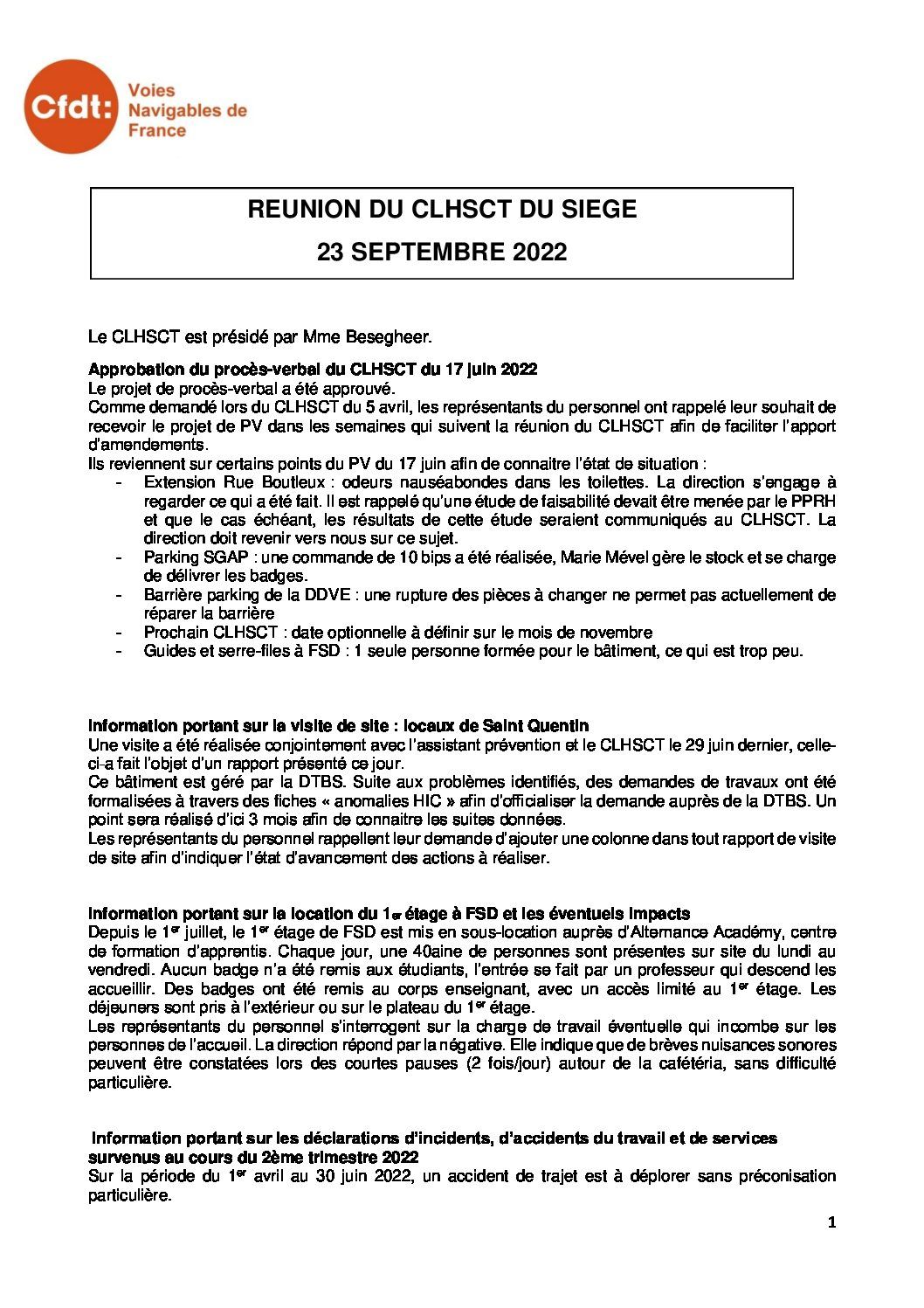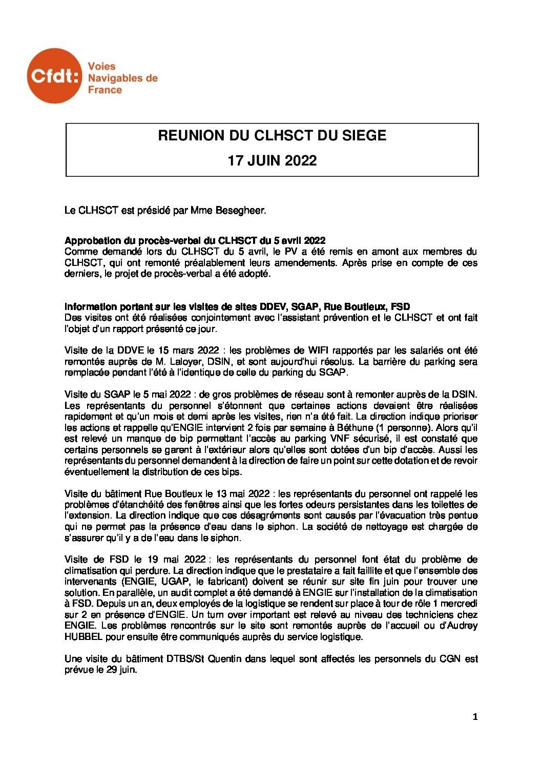 Compte rendu du CLHSCT du 17 juin 2022