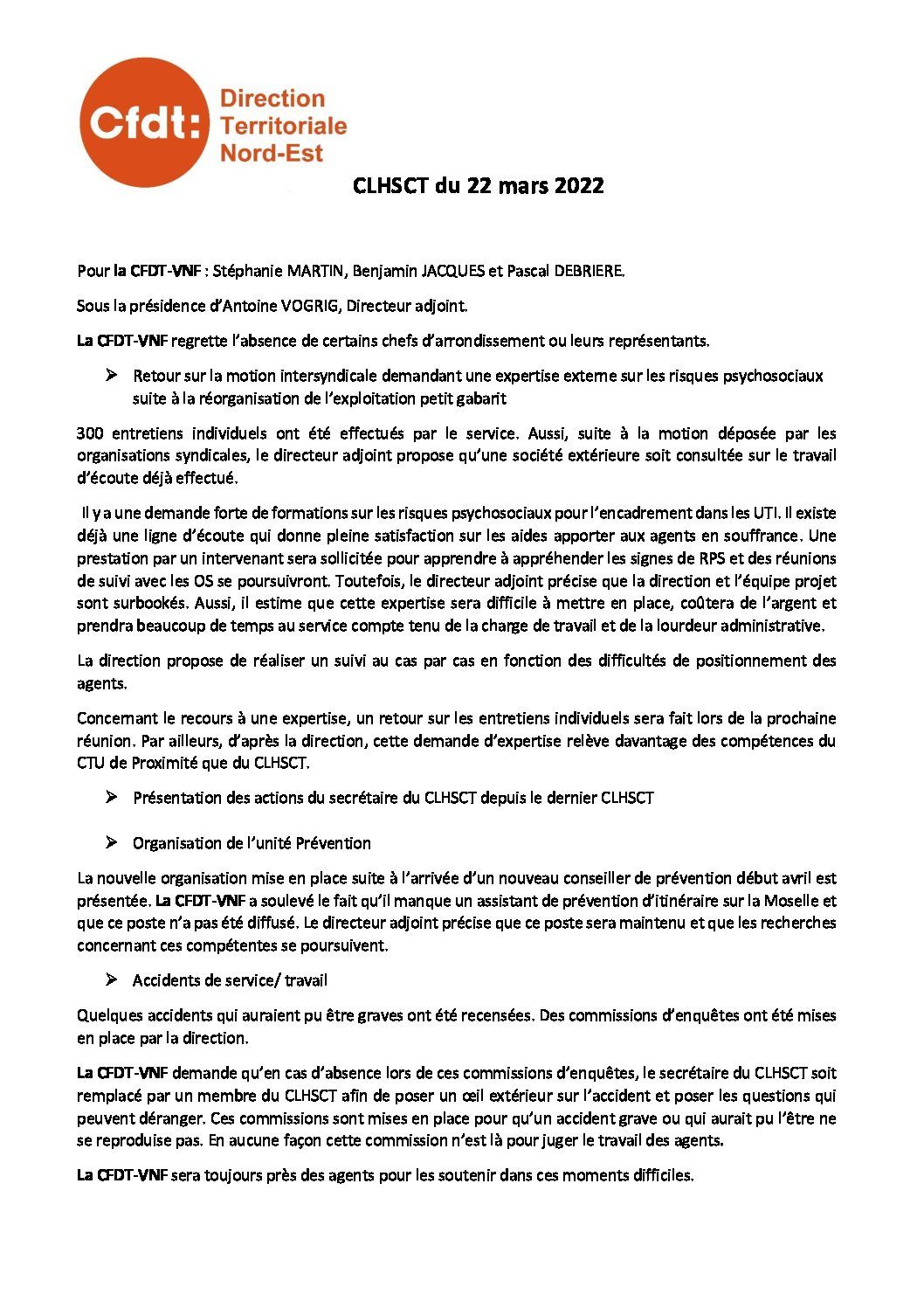 Compte rendu du CLHSCT du 22 mars 2022