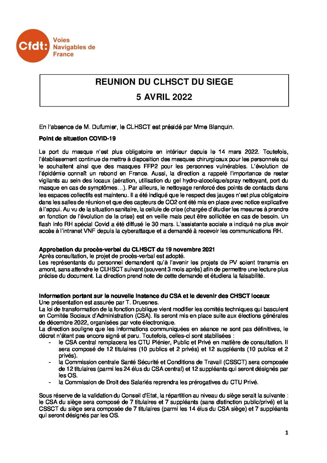 Compte-rendu du CLHSCT du 5 avril 2022