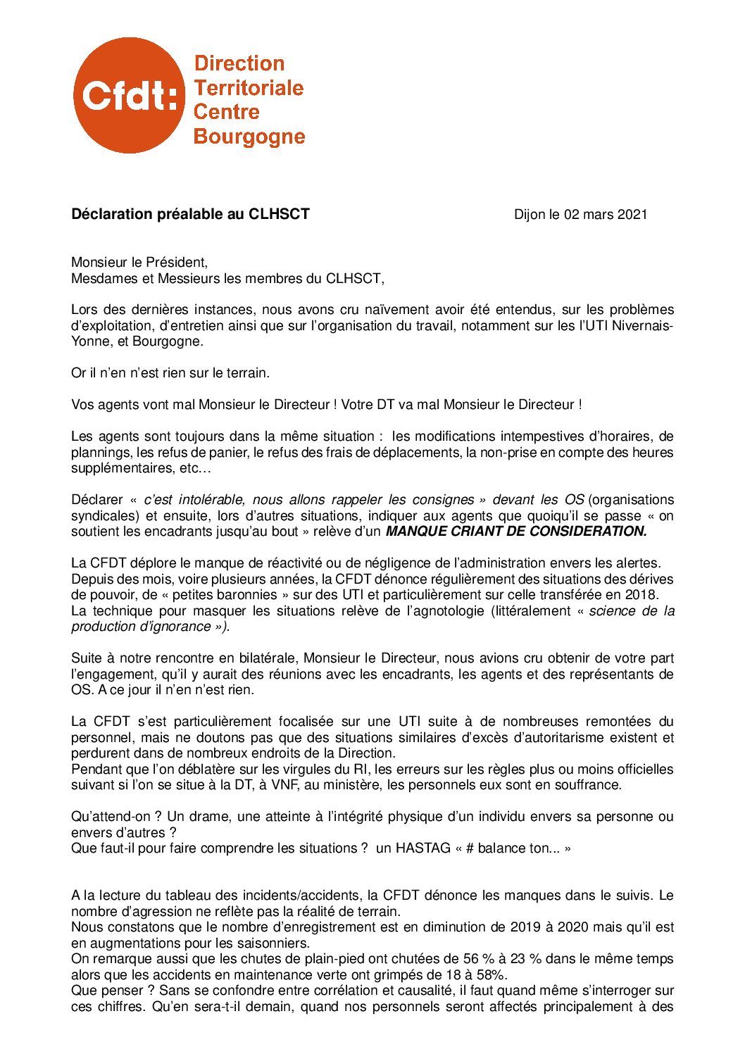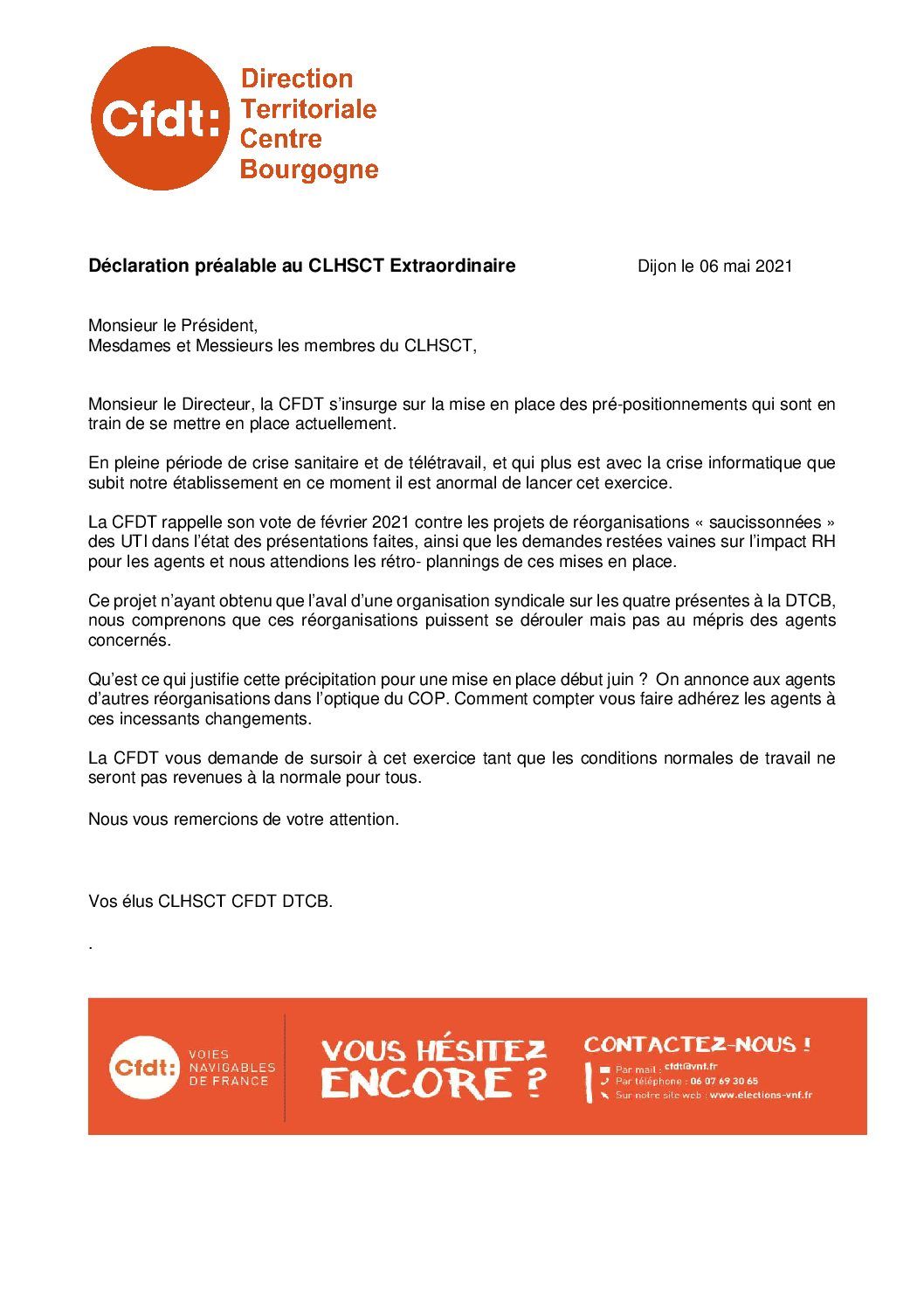 Déclaration CLHSCT Extraordinaire 06 mai 2021 de la DT Centre Bourgogne
