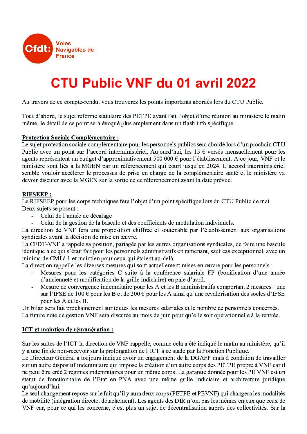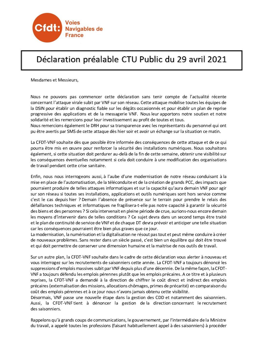 Déclaration préalable CFDT VNF au CTU public du 29 juin 2022