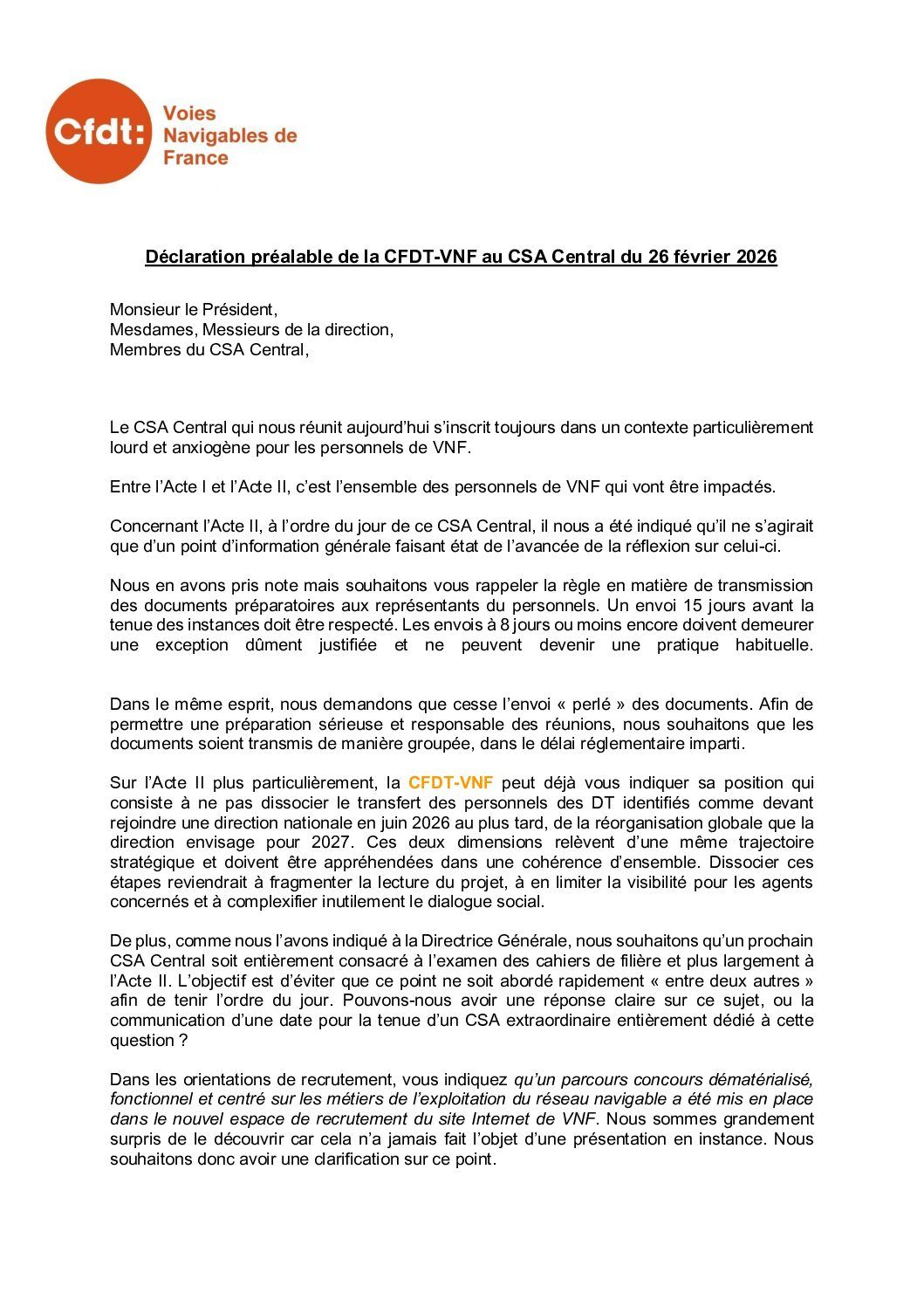 Déclaration préalable au CSA Central du 26 février 2026
