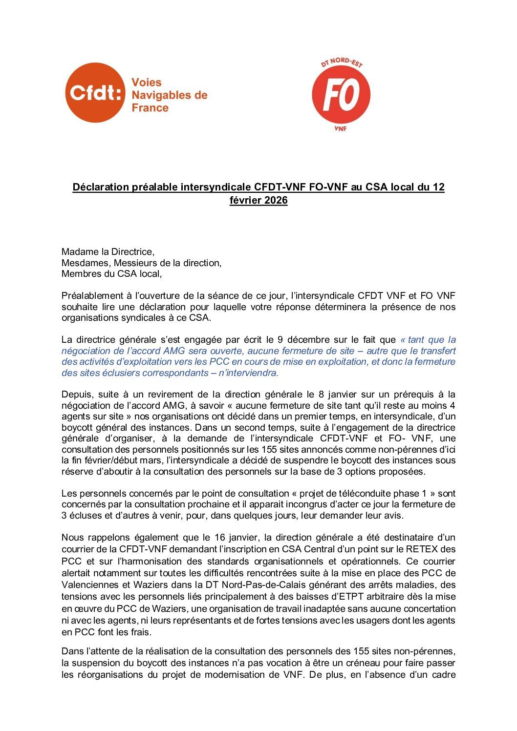 Déclaration préalable au CSAL du 29 janvier 2026