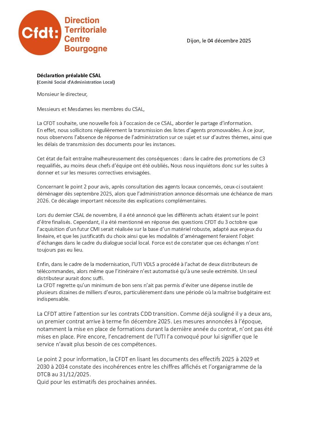 Déclaration préalable au CSAL du 4 décembre 2025