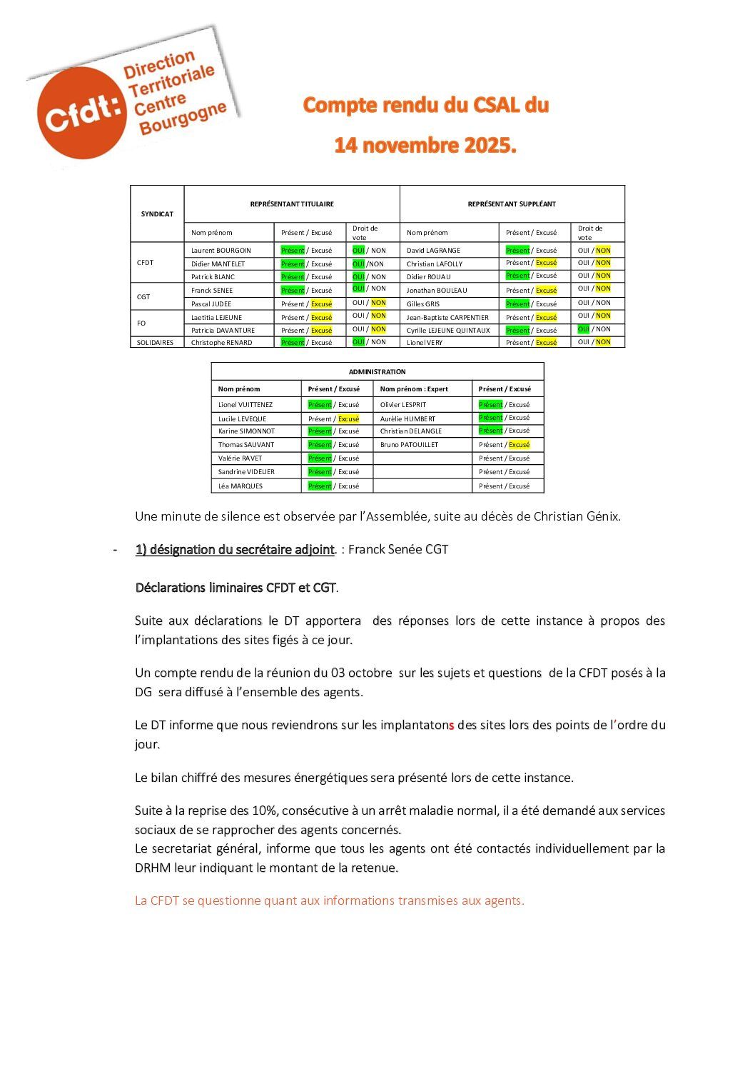 Déclaration préalable au CSAL du 14 novembre 2025