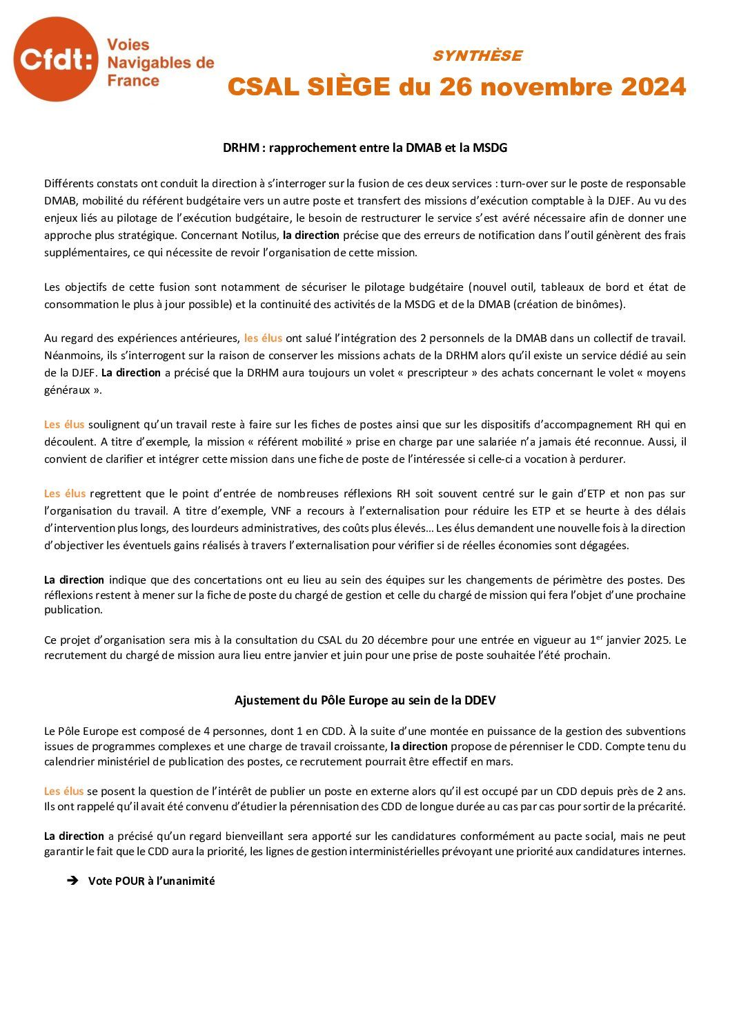 Synthèse du CSAL du 26 novembre 2024