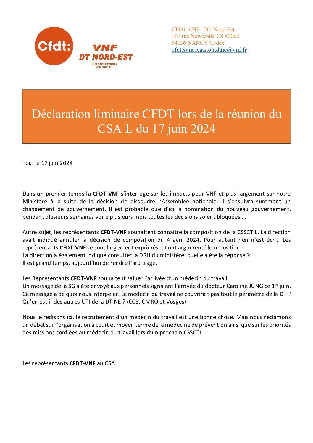 Déclaration préalable au CSAL du 17 juin 2024