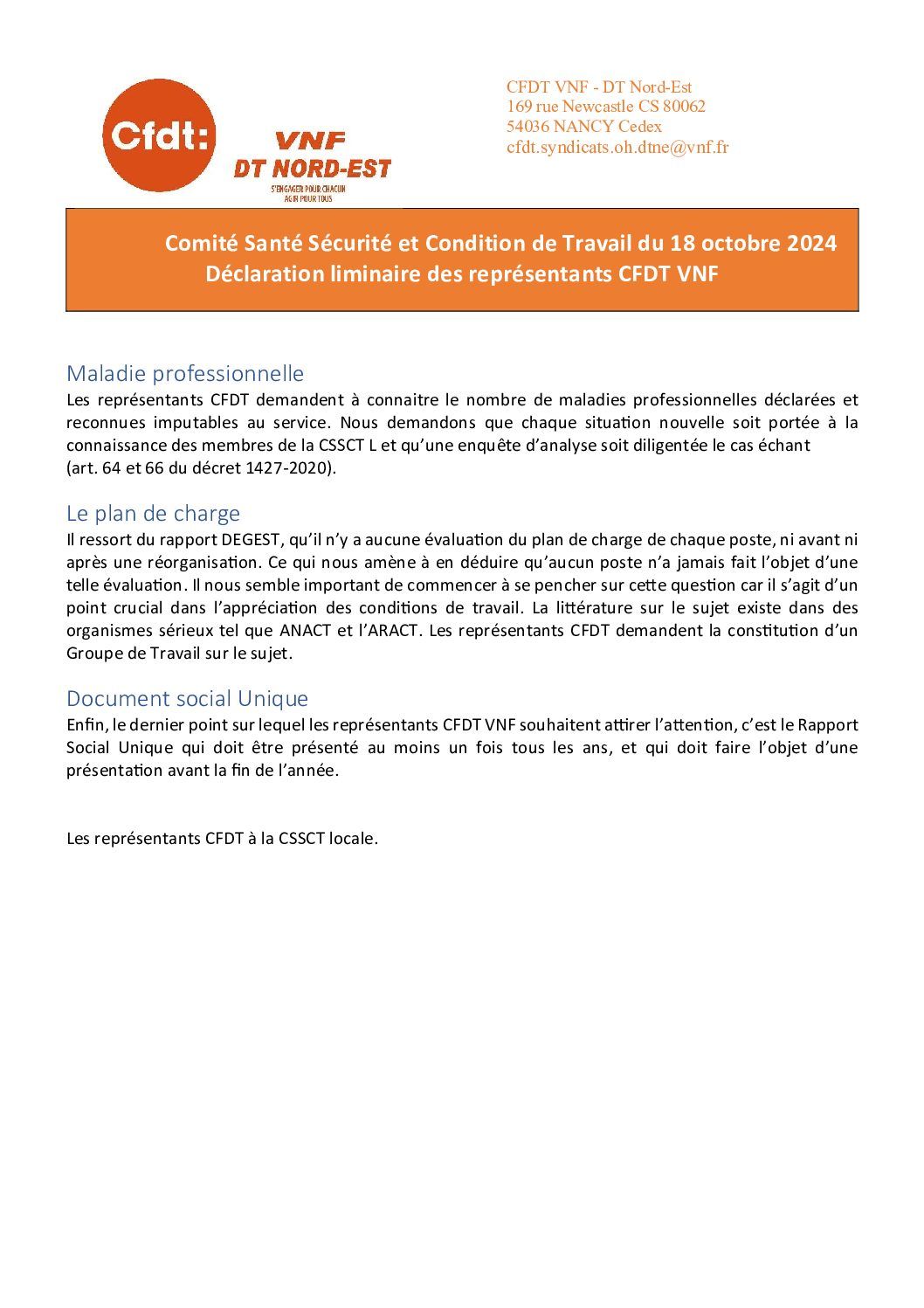 Déclaration préalable à la CSSCT du 18 octobre 2024