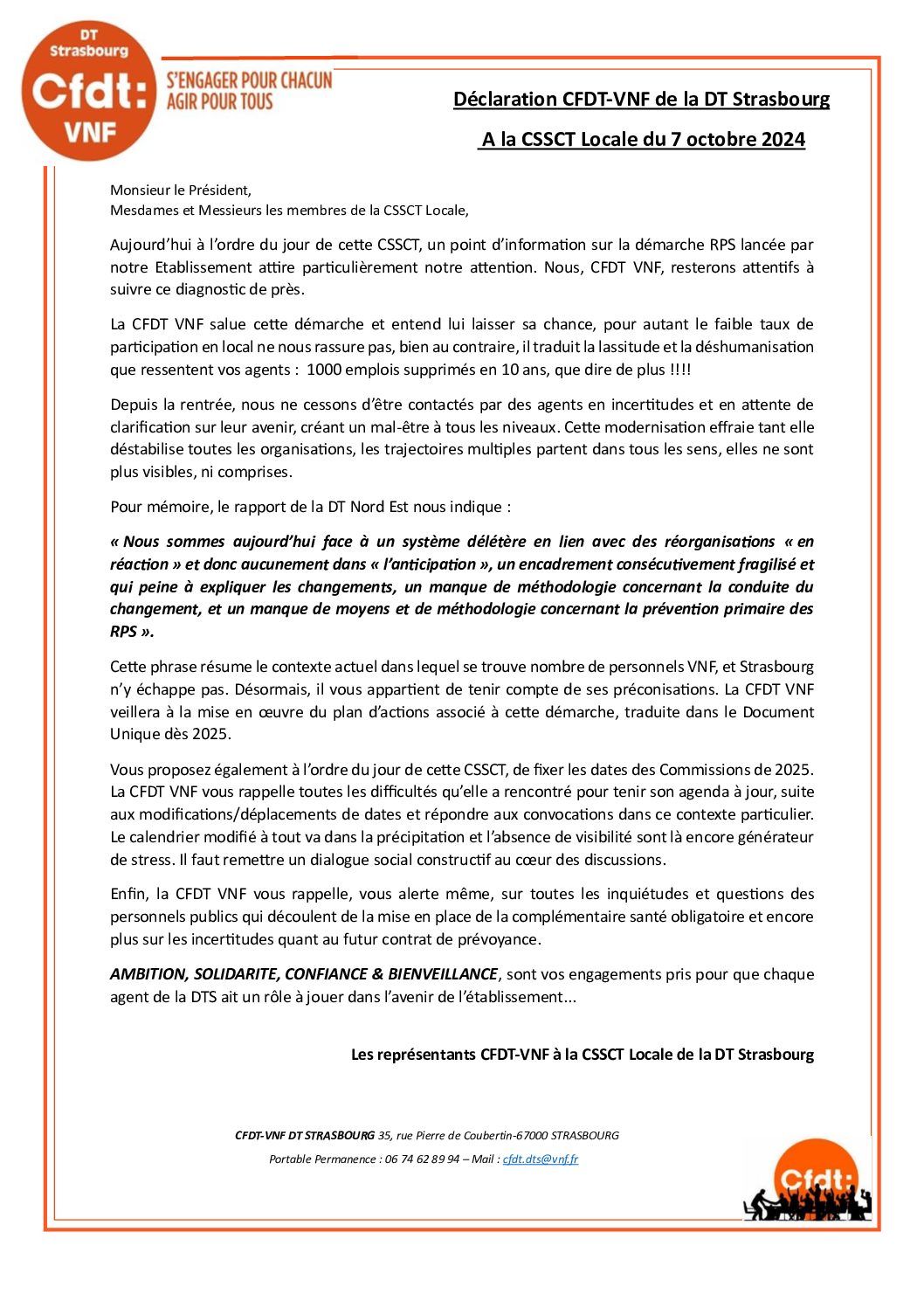 Déclaration préalable à la CSSCT locale du 7 octobre 2024