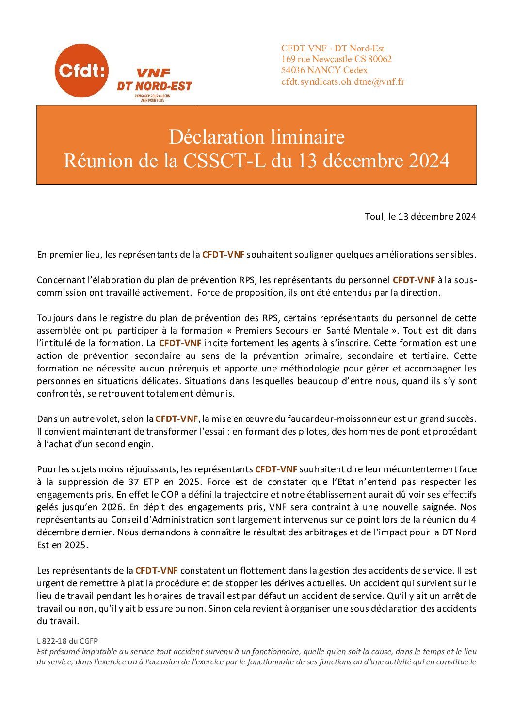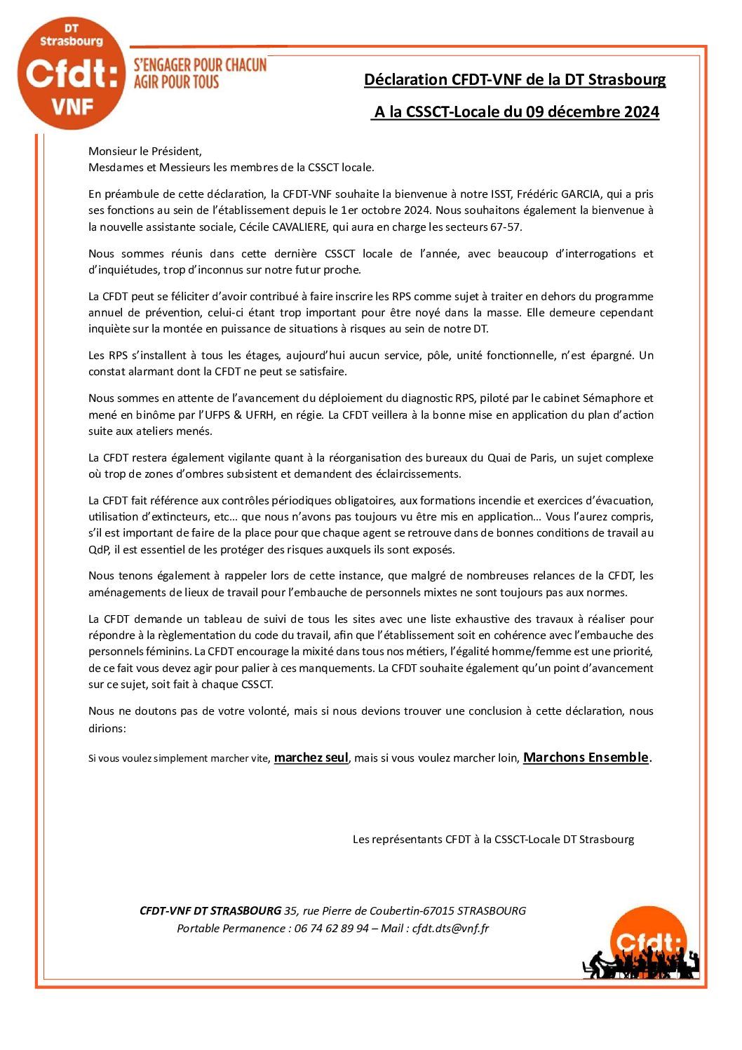 Déclaration préalable à la CSSCT du 13 décembre 2024