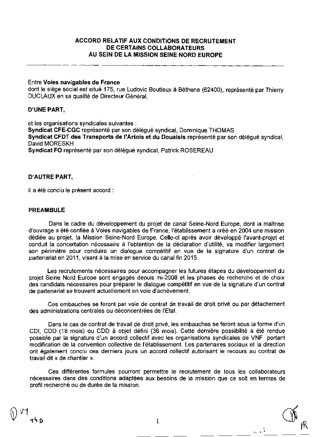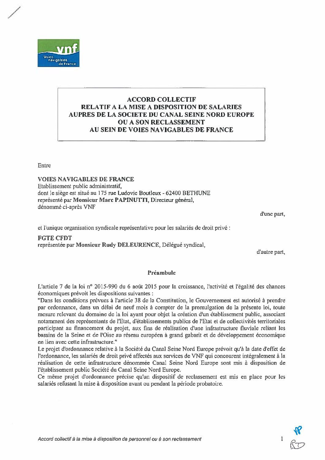 Accord la mise à dispo de salariés auprès de CSNE ou a son reclassement au sein de VNF – 7 avril 2016